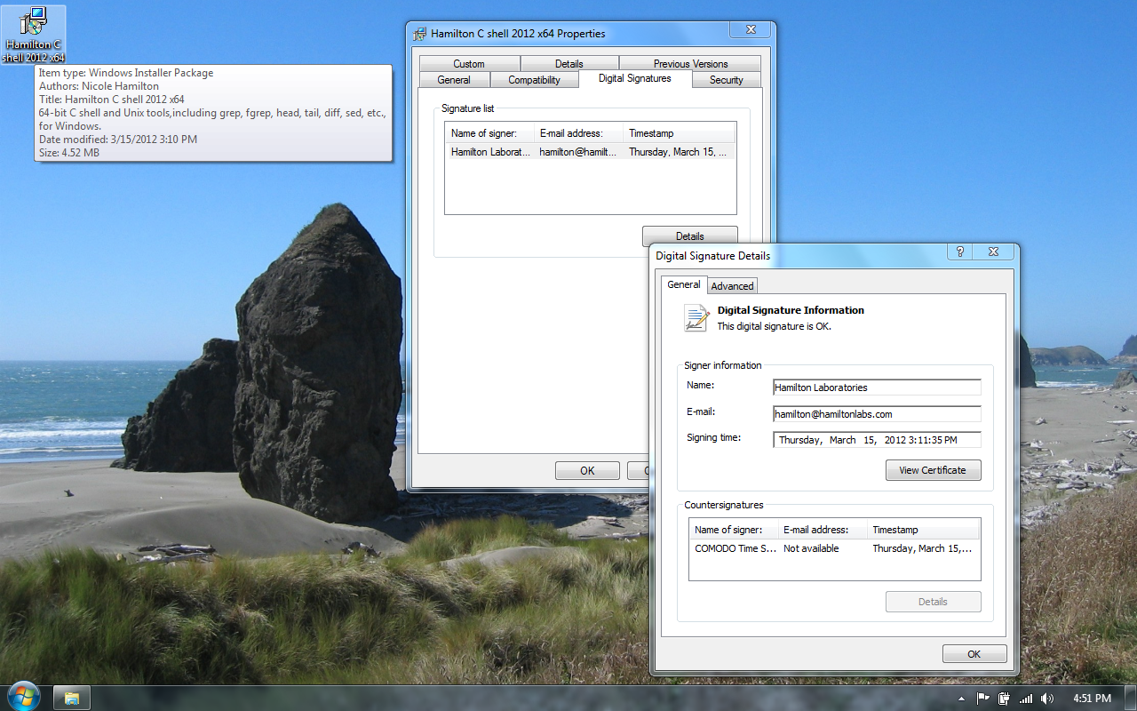 Hamilton C shell™ is a complete Unix shell environment for Windows, including all the important utilities, mv, cp, rm, more, grep, fgrep, head, tail, diff, sed, cron, tar and so on. There’s even a real chown, a real su (super user) and a sudo alias to run a command elevated. And everything works under every version of Windows ever made, including the latest, Windows 10 and 11.